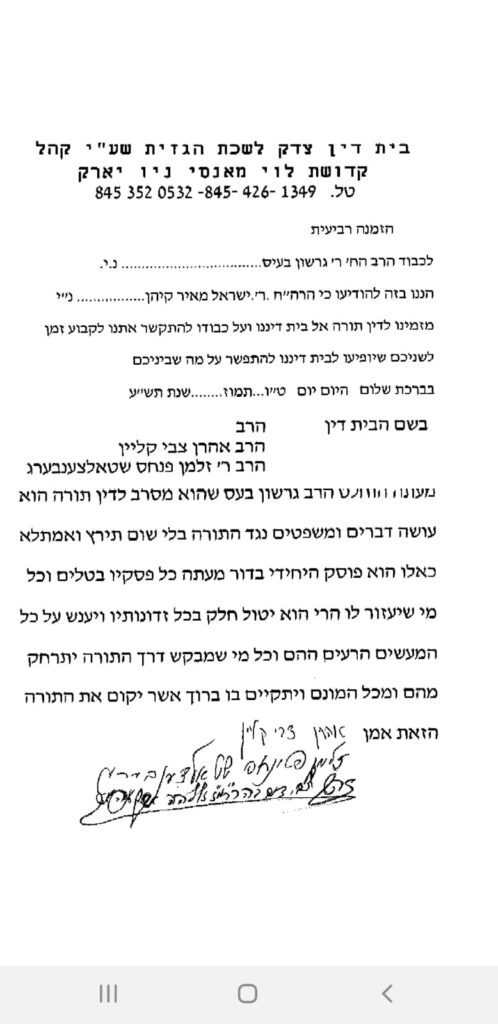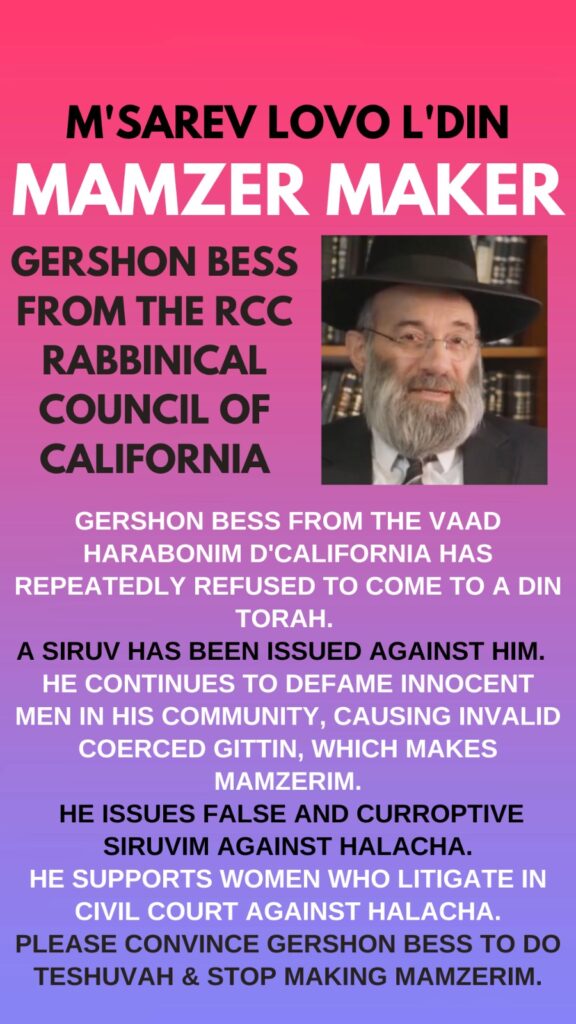 Loose translation of attached Siruv Letter against Gershon Bess of the Rabbinical Council of California (RCC) Gershon Bess is refusing to come to bais Din. He falsely makes up Piskei Din against the Torah without any basis or explanations for his words, as if he’s the only Posek in our generation. Therefore, henceforth, all his Piskei Din are Battul and anyone that helps him (editor: this includes Osniel Rosen and his WhatsApp group supporters) they receive a portion of his sins and he will be punished for all his evil actions. Anyone that is looking for the true Torah path, should distance himself from them and their supporters, and it should be fulfilled “Blessed are those that uphold This Torah”, Amen.