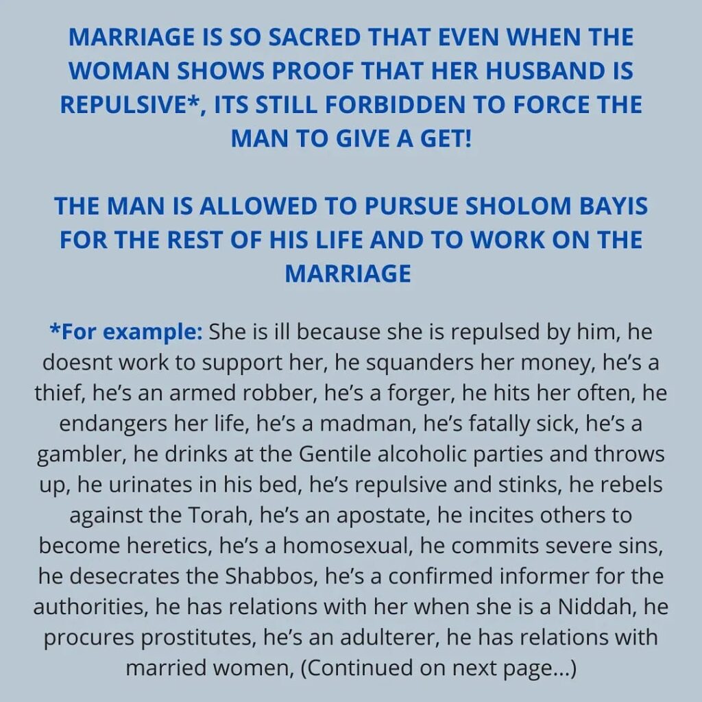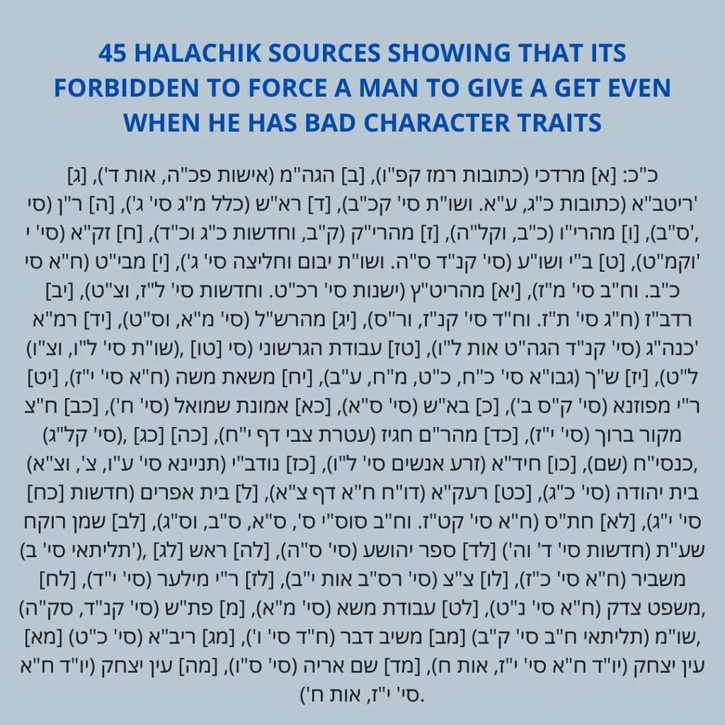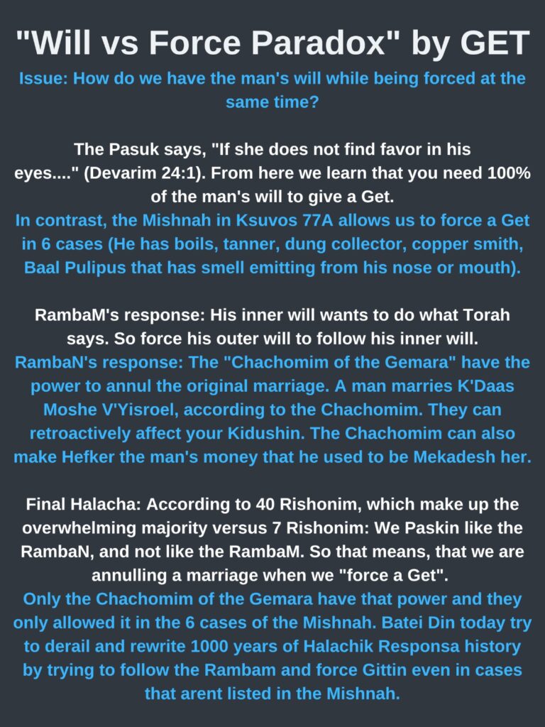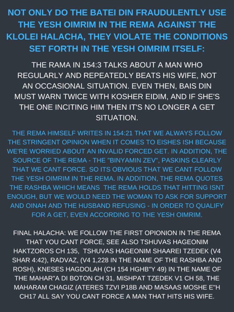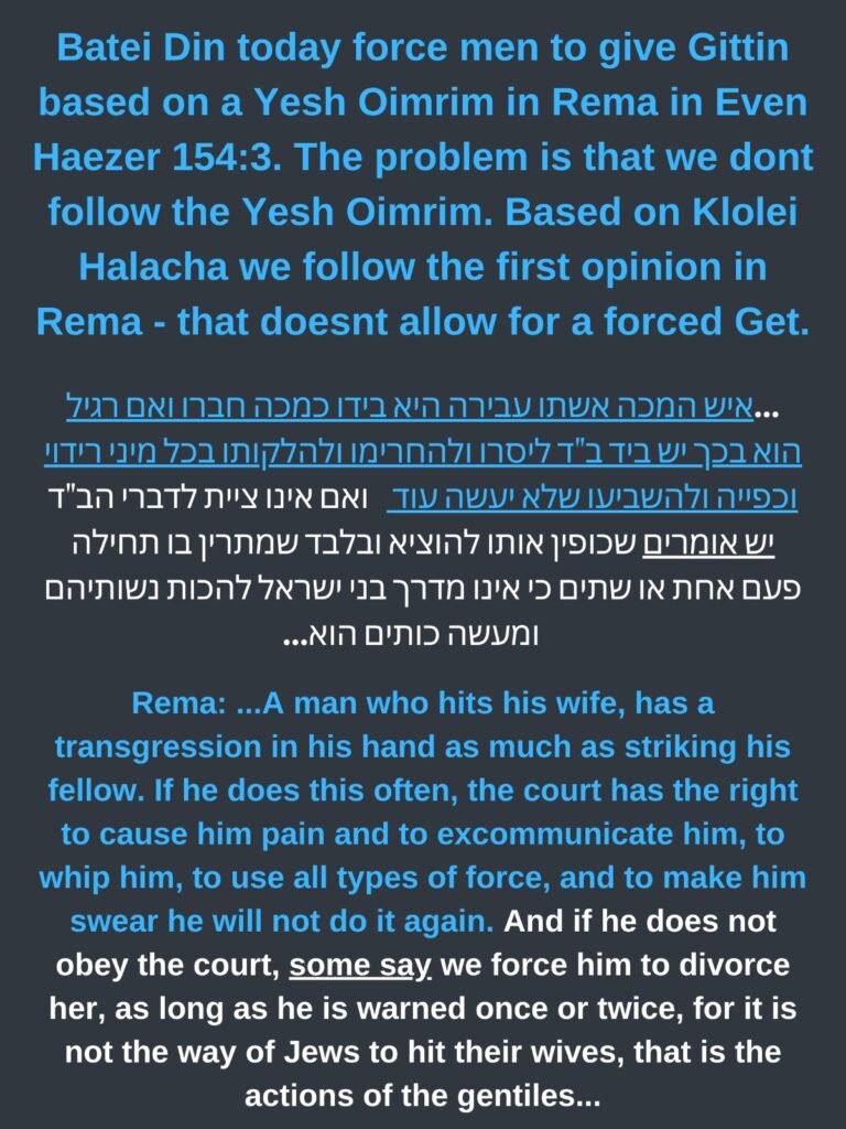 NOT ONLY DO BATEI DIN FORCE GITTEN BY FRUADULENTLY USING A YESH OIMRIM, THEY EVEN VIOLATE THE CONDITIONS OF THAT YESH OIMRIM AS WELL SEE ๐ BELOW THE WORD FORMAT AND LINK TO THE FULL SOURCE OF THE โ๏ธ ABOVE POSTS: Not only do the Batei Din fraudulently use the Yesh Oimrim in the Rema against the Klolei Halacha, they violate the conditions set forth in the yesh oimrim itself: The Rema in 154:3 talks about a man who regularly and repeatedly beats his wife, not an occasional situation. even then, Bais din must warn twice with kosher eidim, and if she’s the one inciting him then it’s no longer a Get situation. The Rema himself writes in 154:21 that we always follow the stringent opinion when it comes to Eishes Ish because we’re worried about an invalid forced Get. In addition, the source of the Rema – the “Binyamin Zev”, Paskins clearly that we cant force. So its obvious that we cant follow the Yesh Oimrim in the Rema. In addition, the Rema quotes the Rashba which means the rema holds that hitting isnt enough, but we would need the woman to ask for support and Oinah and the husband refusing – in order to qualify for a get, even according to the Yesh Oimrim. Final Halacha: We follow the first opionion in the rema that you cant force, see also tshuvas Hageonim haktzoros ch 135, tshuvas Hageonim shaarei tzedek (v4 shar 4:42), radvaz, (v4 1,228 in the name of the rashba and rosh), kneses hagdolah (ch 154 HGHB”Y 49) in the name of the mahar”a di boton ch 31, mishpat tzedek v1 ch 58, the maharam chagiz (ateres tzvi p18b and masaas moshe e”H ch17 all say you cant force a man that hits his wife. Batei Din today force men to give Gittin based on a Yesh Oimrim in Rema in Even Haezer 154:3. The problem is that we dont follow the Yesh Oimrim. based on Klolei Halacha. Instead, we follow the first opinion in Rema – that doesnt allow for a forced Get. โฆืืืฉ ืืืื ืืฉืชื ืขืืืจื ืืื ืืืื ืืืื ืืืจื ืืื ืจืืื ืืื ืืื ืืฉ ืืื ื”ื ืืืกืจื ืืืืืจืืื ืืืืืงืืชื ืืื ืืื ื ืจืืืื ืืืคืืื ืืืืฉืืืขื ืฉืื ืืขืฉื ืขืื ืืื ืืื ื ืฆืืืช ืืืืจื ืื”ื ืืฉ ืืืืจืื ืฉืืืคืื ืืืชื ืืืืฆืื ืืืืื ืฉืืชืจืื ืื ืชืืืื ืคืขื ืืืช ืื ืฉืชืื ืื ืืื ื ืืืจื ืื ื ืืฉืจืื ืืืืืช ื ืฉืืชืืื ืืืขืฉื ืืืชืื ืืืโฆ Rema:โฆโฆA man who hits his wife, has a transgression in his hand as much as striking his fellow. If he does this often, the court had the right to cause him pain and to excommunicate him, to whip him, to use all types of force, and to make him swear he will not do it again. And if he does not obey the court, Yesh Oimrim say we force him to divorce her, as long as he is warned once or twice, for it is not the way of Jews to hit their wives, that is the actions of the gentiles. This only applies when he is the one who initiates the hitting, but if she curses him for no reason, or mocks his father and mother, and she contradicts what he says and he has no authority over her, some say it is permitted to hit her. And some say that a bad wife is [also] prohibited to strike. The first opinion is the essential one. If it is not known who started it, the husband is not believed to say that she started it, for all women are assumed kosher, and they place others among them to see who is the bad one. And if she curses him for no reason, she is divorced without her ketubah. And it seems to me that this is only when this happens often, and after warning, โฆ.. See original source: https://www.sefaria.org/Shulchan_Arukh%2C_Even_HaEzer.154.3?lang=bi&with=Commentary&lang2=en