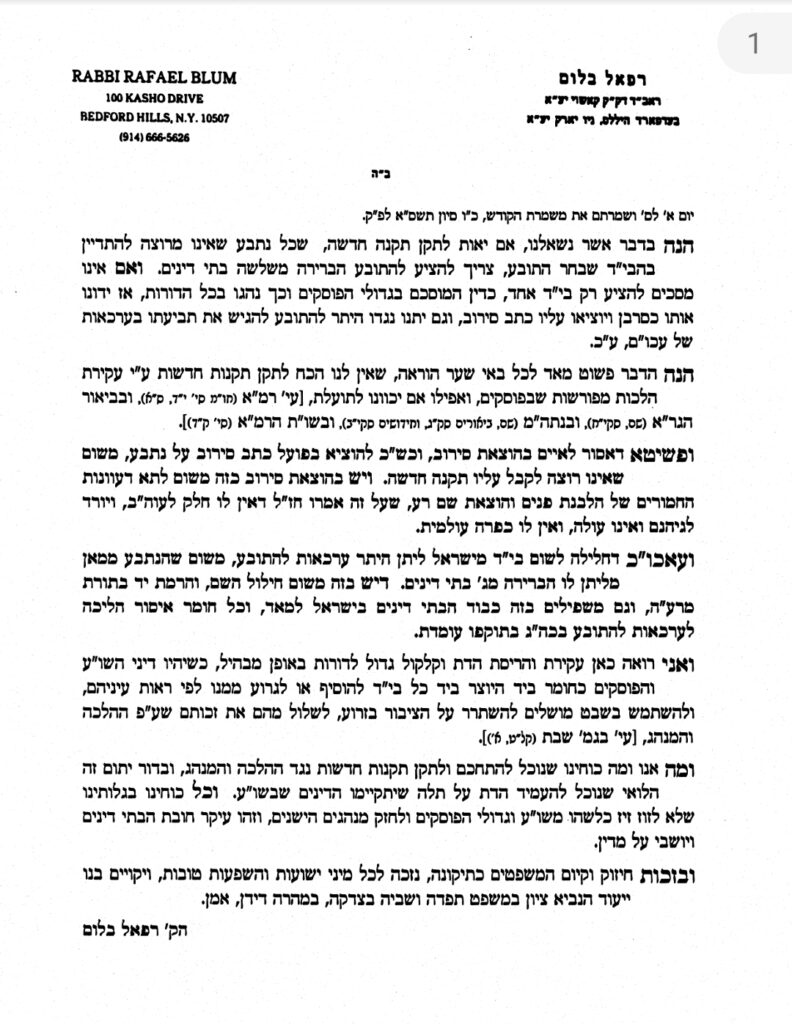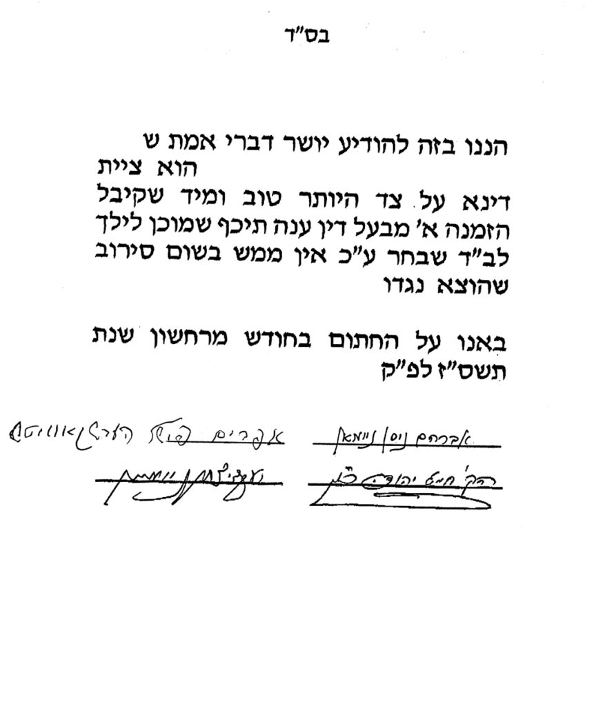 Please see the above letter with audio recording of loose translation of the Halachik letter from Rabbi Blum Shlit”a ruling that the Defendant (Nitvah) doesnt need to offer a choice of 3 different Batei Din to the Plaintiff (Tove’ah). So long as the defendant offers one Bais Din, he is not considered to be “refusing” to listen to Bais Din – he is not considered to be Mesarev L’Din. This is what the Poskim always said throughout all the generations.