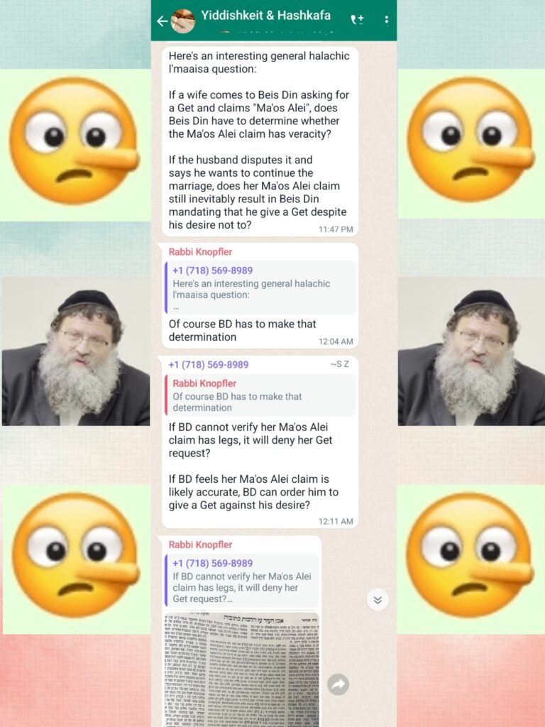 See the page R’ Knopfler posted from Shulchan Aruch in end of the attached whatsapp screenshot. R’ Knopfler misuses and misquotes a source that talks about “monetary issues” (Bais Din making a determination if we make her return what she grabbed on her way out) and intentionally confuses the public to say that its talking about forcing a Get! This is his actual admission to the public that he’s forcing Gittin against halacha and making Mamzerim.
