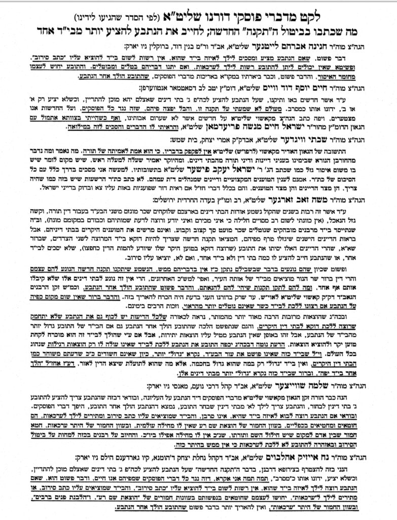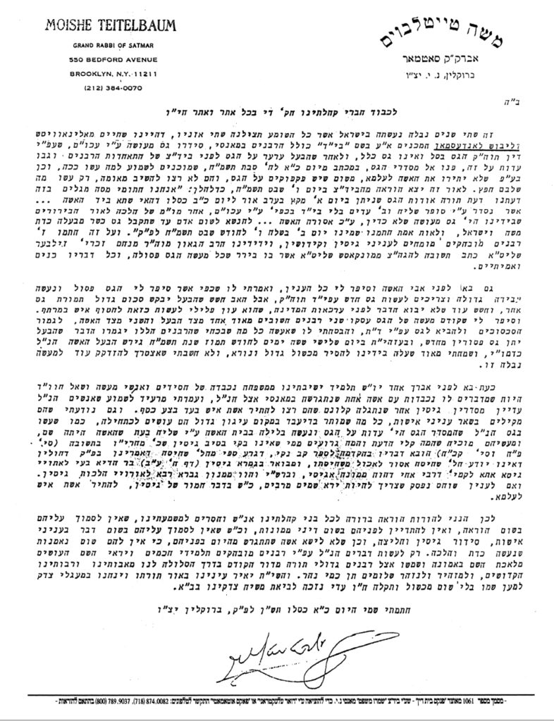 In this letter the Satmar Rav proclaimed all Gittin of Rav Leibish Landesman to be Passul. This audio recording is a loose translation of the above letter about Rav Leibish Landesmen that his Gittin are invalid.