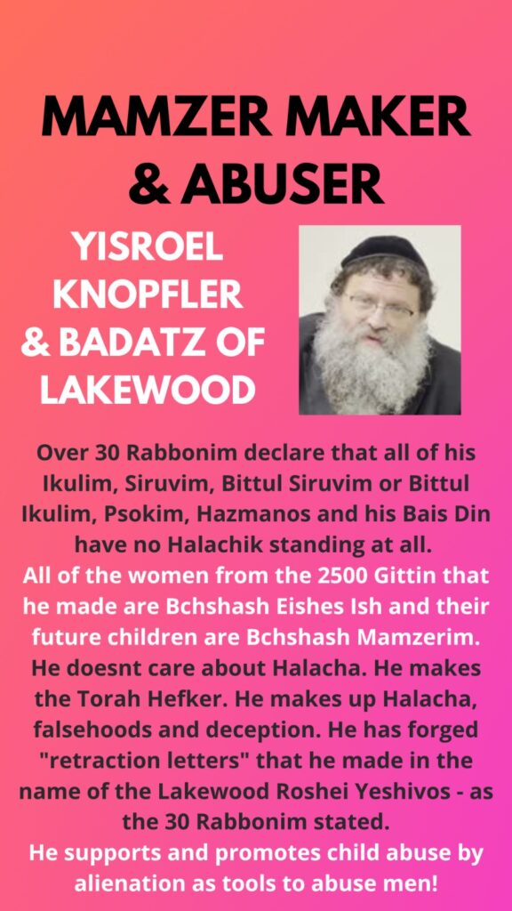 There are extreme cases throughout history (see attached posts with many examples) that the Poskim did not allow for a forced Get, even though the man had a proven and well-known bad character trait! How does R’ Knopfler create nonsense out of thin air to force a Get by Amasla M’vureres – especially when the men he forces are actually decent upstanding husbands that he just creates a false narrative about them to fit his picture and keep making more money off of Dinei Torah and Gittin-on-Demand! Even if they were bad men, the Gedolei HaPoskim still wouldnt allow for force as it makes Mamzerim.