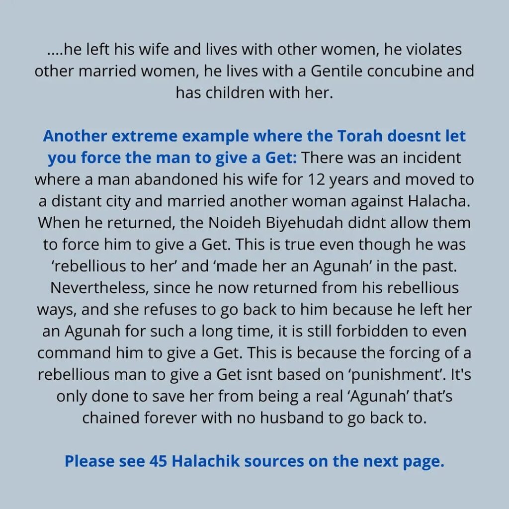 On a side note, the Torah only considers a woman an Agunah that we could force a Get when her husband is refusing to give her Oinah. And that is only true when Bais Din determines that he’s not holding it back due to her fighting with him. If she was causing it, she is a Moredes and there’s no grounds to force a Get.