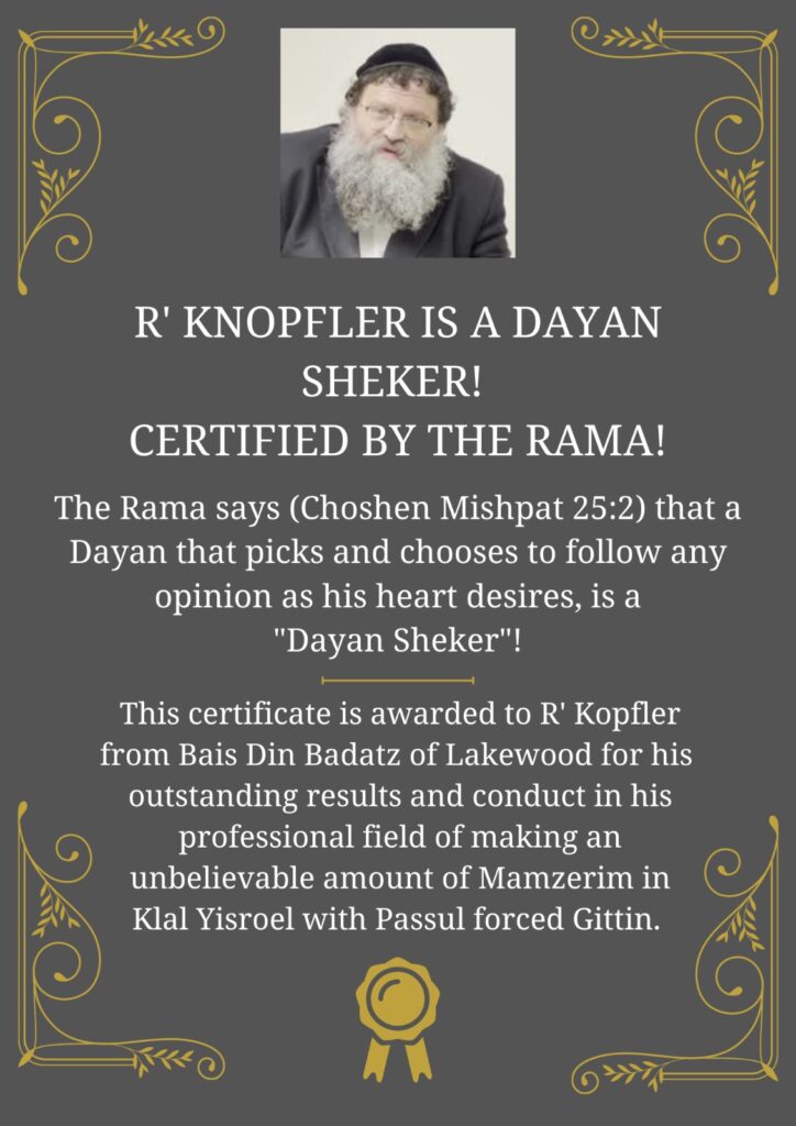 R’ KNOPFLER IS A DAYAN SHEKER – CERTIFIED BY THE RAMA!